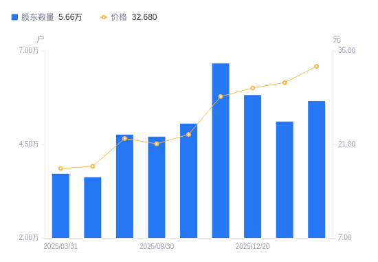 1月15日动静,数据显示,截至2026年1月10日,上海沪工A股股东总户数为5。66万户,较上期(2025年12月31日)添加5454户,增幅10。67%。公司最新A股总股本为3。28亿股,此中畅通A股3。28亿股,户均持有畅通A股数量为5805。65股,较上期削减619。31股,较上期削减4626。35元,降幅2。38%。近一年(2025年3月31日至2026年1月10日),上海沪工A股股东户数从3。71万户,添加至5。66万户,增幅52。31%,区间股价上涨83。41%。